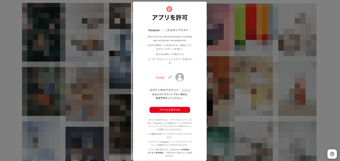 4. Pinterestアドのログイン画面が表示されますので、Databeatにご登録いただく予定の広告アカウントの権限をお持ちのログインアカウントでログインしてください。