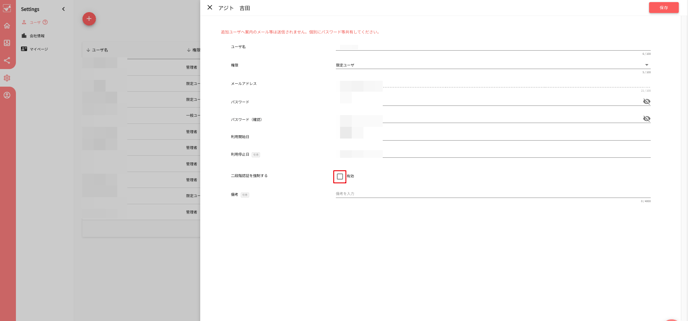 何らかの理由により解除したい場合は、管理者権限のユーザーが「二段階認証を強制する」の「有効」からチェックを外す必要があります。