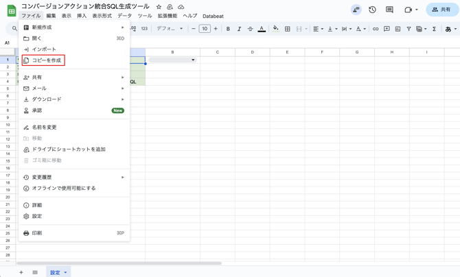 1. スプレッドシート「コンバージョンアクション統合SQL生成ツール」を開き、コピーを作成します。