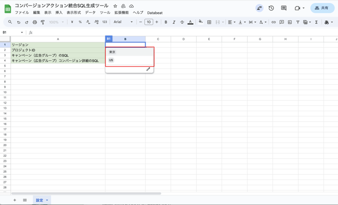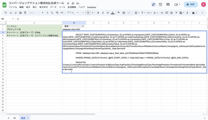 後から設定を確認するためにこちらのツールは同じスプレッドシートを使い回すのではなく、使用するデータベースごと、出力するプロモーションごとに新規で作成することをおすすめいたします。