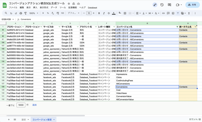 このシートには、コンバージョン詳細のSQLから出力されたGoogle、Yahoo!、Microsoftの各コンバージョンアクションと、キャンペーンのSQLから出力されたその他の媒体の各指標が出力されます。